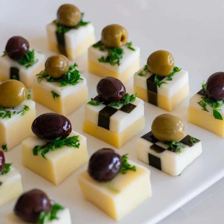 Save A visually striking appetizer featuring alternating cubes of cheese and olives arranged like a chessboard. Perfect for parties and gatherings.