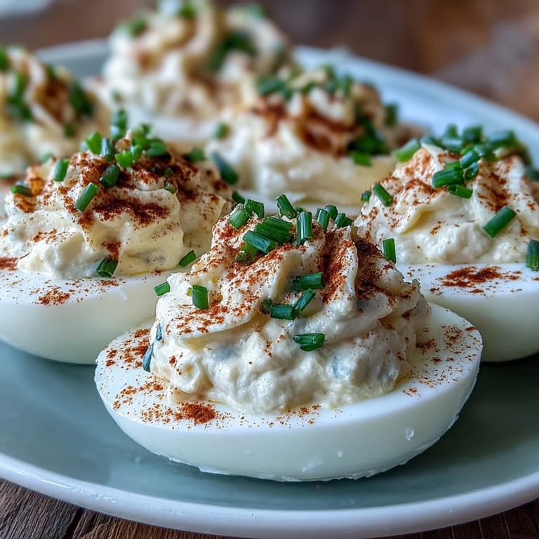 Save The sound of boiling eggs disrupts the quiet hum of my kitchen whenever I make deviled eggs. It's funny how such a simple snack brings a sense of anticipation—even my dog watches closely, nose twitching, as the scent of eggs intensifies. One rainy Sunday, I discovered how smoky paprika transformed the classic recipe when I sprinkled it accidentally instead of regular. That little twist turned a routine into a ritual, especially when finishing with a flourish of fresh chives. These deviled eggs always feel less like a party dish and more like a mini celebration of small mistakes that end up perfect.
