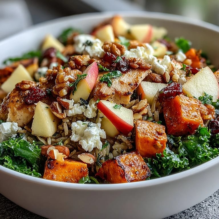 The order of assembly matters more than people realize. I learned this the hard way when I put the cheese down first and it got buried and cold by the time I finished layering. Starting with kale as your base keeps everything else from sliding around, and layering the warm components first means they hold their temperature better. The cold elements—apple, cheese, almonds—go on top where they stay crisp and visible. It's the kind of small architecture that makes the difference between a bowl that feels intentional and one that looks like you got impatient.