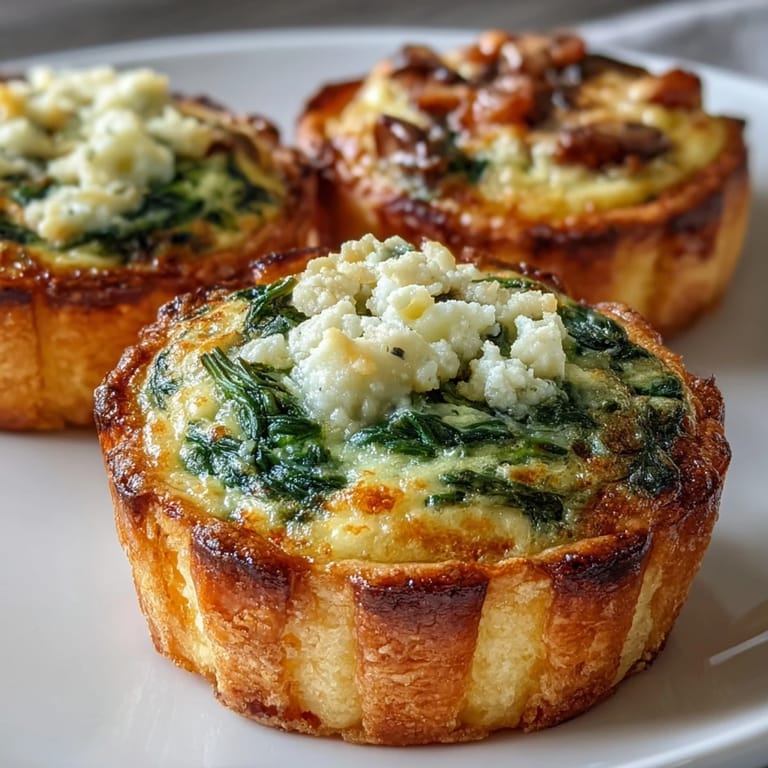 For a gluten-free version, use gluten-free pastry. Swap feta with goat cheese or Gruyère with cheddar as desired. Add fresh herbs like chives or parsley for extra flavor. You can easily make all 18 quiches vegetarian by replacing the ham filling with another vegetable option—try roasted red peppers with mozzarella, or caramelized onions with blue cheese. For a dairy-free alternative, use plant-based cream and cheese substitutes, though the texture will be slightly different. Feel free to experiment with seasonal ingredients: asparagus and Parmesan in spring, sun-dried tomatoes and basil in summer, or butternut squash and sage in autumn.