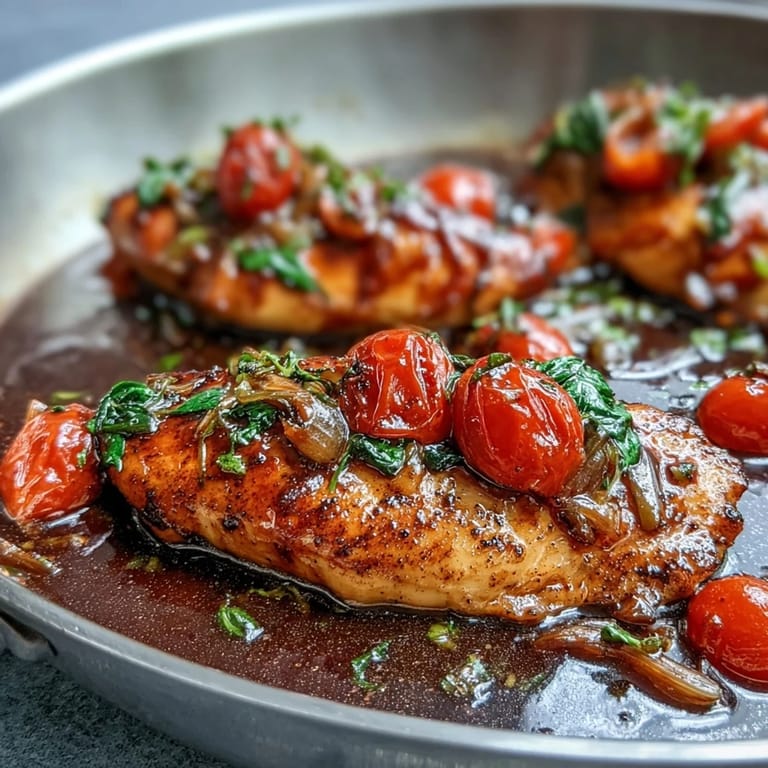 Save My kitchen smelled like a Mediterranean restaurant the first time I threw this together on a Wednesday night when I had nothing planned and a package of chicken breasts staring at me from the fridge. What started as me hunting through the pantry for something quick turned into this stunning one-pan situation that my partner couldn't stop talking about. The balsamic vinegar caught my eye—I'd been using it for salads forever but never thought to build an entire dish around it. Turns out, that tangy-sweet glaze was exactly what chicken needed, and the spinach wilting into the warm tomatoes felt like watching magic happen in real time. Thirty-five minutes later, I had the kind of meal that tastes like you actually tried.