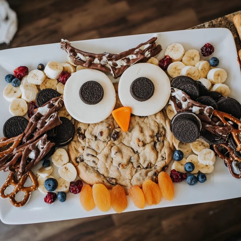 Save A whimsical dessert board inspired by the enchanting sounds of the night, featuring an assortment of sweets and treats creatively arranged to resemble a wise owl. Perfect for parties, family gatherings, or themed events.