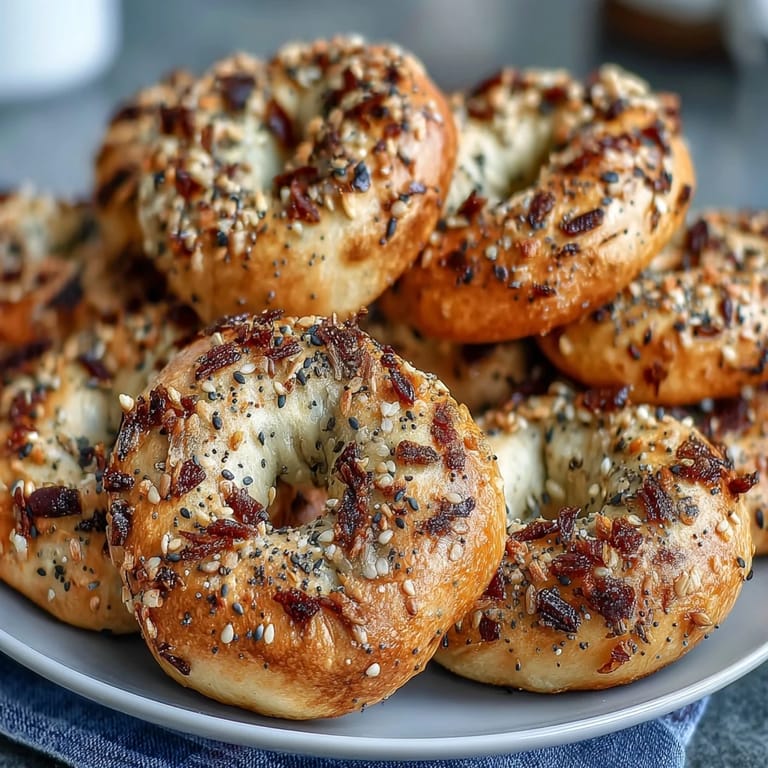 When working with the dough, keep your hands and work surface lightly floured to prevent sticking, but avoid adding too much extra flour or the bagels may become dense. The dough should feel slightly tacky but manageable. If it's too sticky to handle, add flour one tablespoon at a time. When shaping the bagels, make sure to pinch the seams firmly so they don't come apart during baking. For the most even browning, rotate the baking sheet halfway through the baking time. The egg wash is essential for achieving that golden, glossy finish and helping the everything seasoning stick, so don't skip this step.