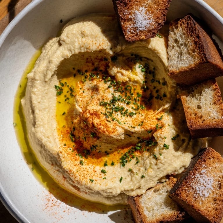- Transfer hummus to a serving bowl. Drizzle with olive oil and sprinkle with paprika. Serve rosemary crackers alongside hummus for dipping.