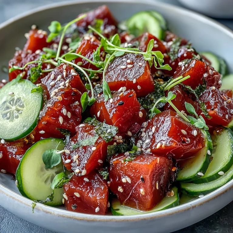 Save There's a peculiar thrill in opening a tub of sushi-grade tuna—the color always makes me pause, eager for that clean, briny scent. Early spring sunlight once found me prepping this poke bowl with the kitchen window cracked open, the sound of birds above punctuating my careful slicing of radishes and cucumber. Sometimes, recipes aren't born from long tradition, but from the sudden craving for something lively and cool on an unexpectedly warm afternoon. The tang of ponzu drifting up from the marinade reminded me of splurging on sashimi at my favorite little spot, wishing I could bottle that freshness at home.