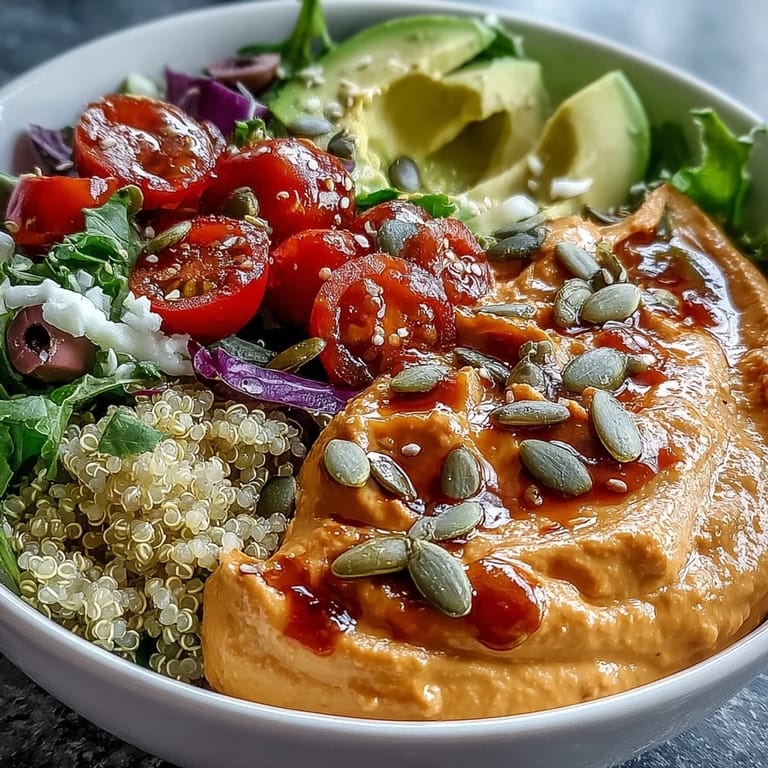 Save My friend texted me a photo of her lunch one Tuesday and I was instantly jealous. This wasn't just any bowl—it was a riot of color with creamy roasted red pepper hummus anchoring crisp vegetables and quinoa. I asked her for the recipe that same afternoon, and what she sent back was simple enough that I made it for dinner that night. Now, whenever I need something that feels both indulgent and nourishing, I come back to this one.