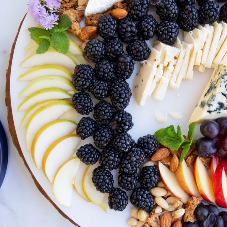 Arrange fresh blackberries in a curved line center on a large board. Place light cheeses, fruits, nuts, and crackers neatly on one side, and darker counterparts on the other side.